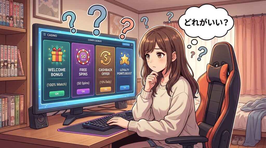 また、入金不要ボーナスに対して「結局やめとけなのでは」と感じる人もいると思います。その感覚自体は自然ですが、問題なのは特典そのものより、仕組みを理解せずに飛びつくことです。このあたりの温度感は、オンカジやめとけは本当?実際にやって分かったこともあわせて読むと、かなり整理しやすいです。