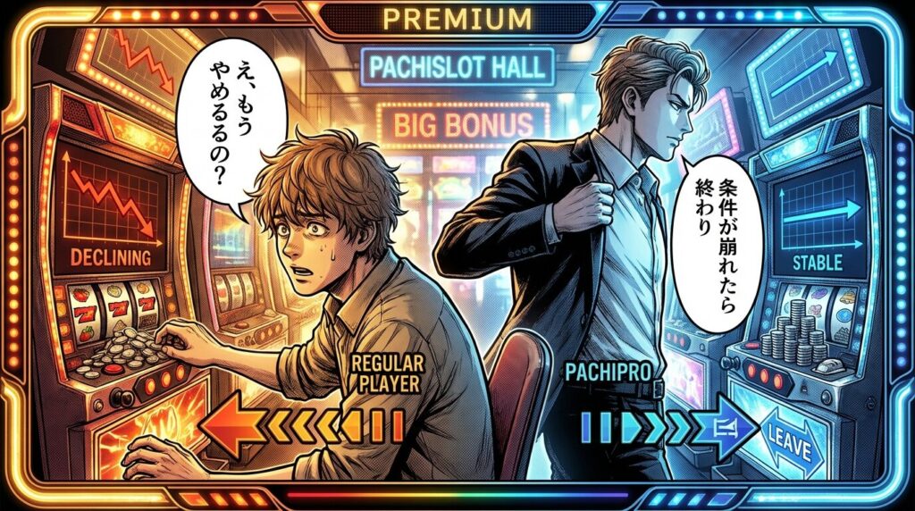 もう一つ大きいのが、やめる判断の速さです。普通の人は「もう少しで当たりそう」「ここまで入れたから戻したい」と考えて粘る。でもパチプロは、条件が崩れた瞬間に迷わずやめる。この差は想像以上に大きいです。スマスロのやめどき完全ガイドでも解説されている通り、やめる判断ができるかどうかで結果は大きく変わる。多くの人は「やめた後に出たら嫌」という感情に負けてしまうけど、パチプロはそこを完全に切り離しています。