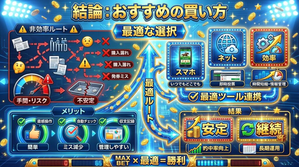 ここまでいろいろ話してきましたが、結局のところ「有馬記念 買い方 おすすめはどれなのか」という話に戻ると思います。自分の結論はかなりシンプルで、迷ったらスマホ・ネット一択です。