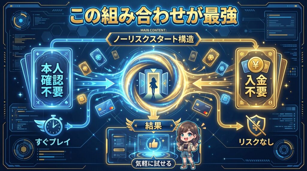 なので、本人確認不要カジノ=完全匿名と考えてしまうとズレますが、「気軽に始められる」という意味ではかなり大きいメリットがあります。